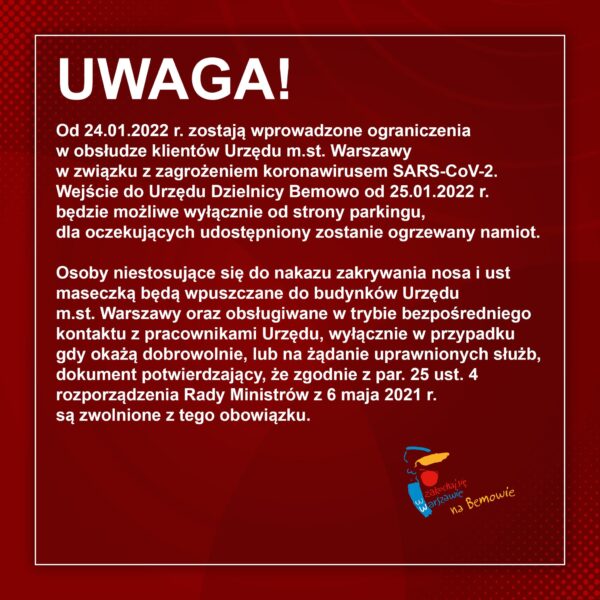 Od 24.01.2022 r. zostają wprowadzone ograniczenia w obsłudze klientów Urzędu m.st. Warszawy w związku z zagrożeniem koronawirusem SARS-CoV-2.‼ Wejście do Urzędu Dzielnicy Bemowo od jutra, 25 stycznia, będzie możliwe wyłącznie od strony parkingu, dla oczekujących udostępniony zostanie ogrzewany namiot. Osoby niestosujące się do nakazu zakrywania nosa i ust maseczką będą obsługiwane w trybie bezpośredniego kontaktu z pracownikami Urzędu m.st. Warszawy wyłącznie w przypadku, gdy okażą dobrowolnie lub na żądanie uprawnionych służb dokument potwierdzający, że zgodnie z par. 25 ust. 4 rozporządzenia Rady Ministrów z 6 maja 2021 r. są zwolnione z tego obowiązku. Szczegóły: https://bemowo.um.warszawa.pl/-/ograniczenia-obslugi-klient….