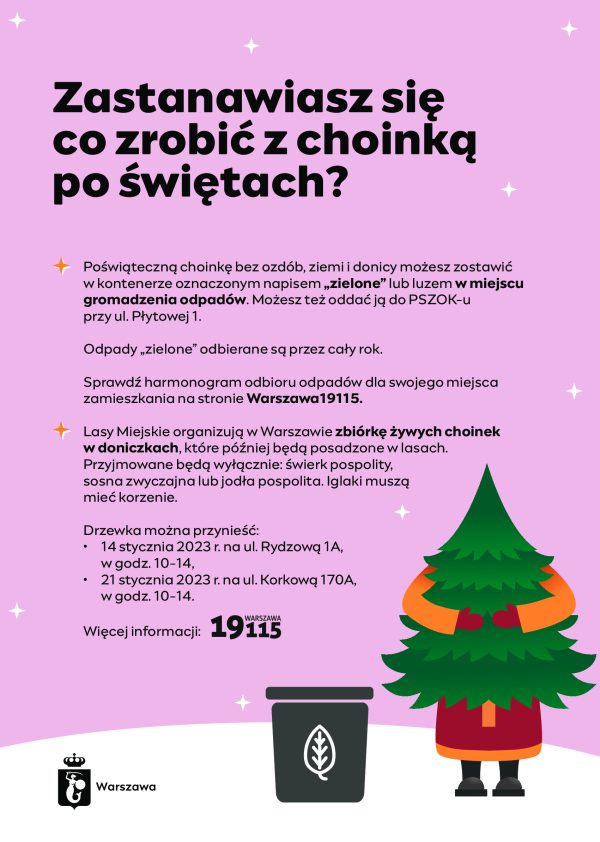 Prosimy o składowanie choinek, przeznaczonych do wyrzucenia, przy stacji Trafo, naprzeciwko klatki 17. Będą one cyklicznie odbierane przez MPO. Jednocześnie prosimy o uprzątnięcie ewentualnych odpadów zielonych, które spadają podczas przenoszenia choinki i zostają na klatce, w windzie lub na schodach.