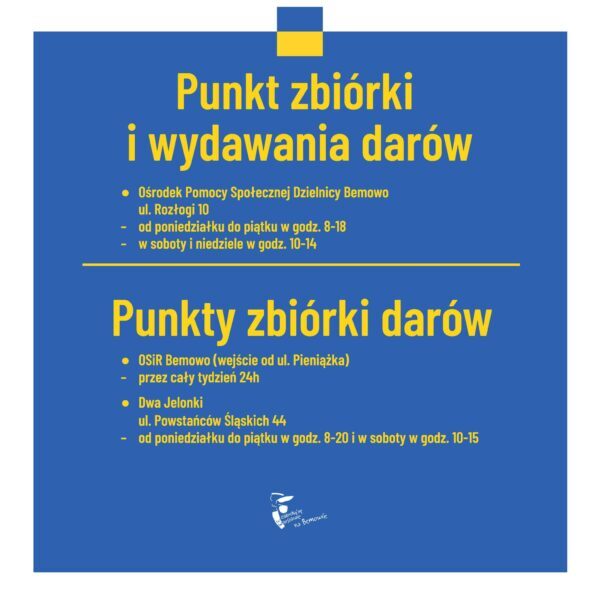 🔸Ośrodek Pomocy Społecznej Dzielnicy Bemowo m.st. Warszawy (zbiórka i wydawanie darów) – od poniedziałku do piątku w godzinach 8-18 oraz w soboty i niedziele w godzinach 10-14.