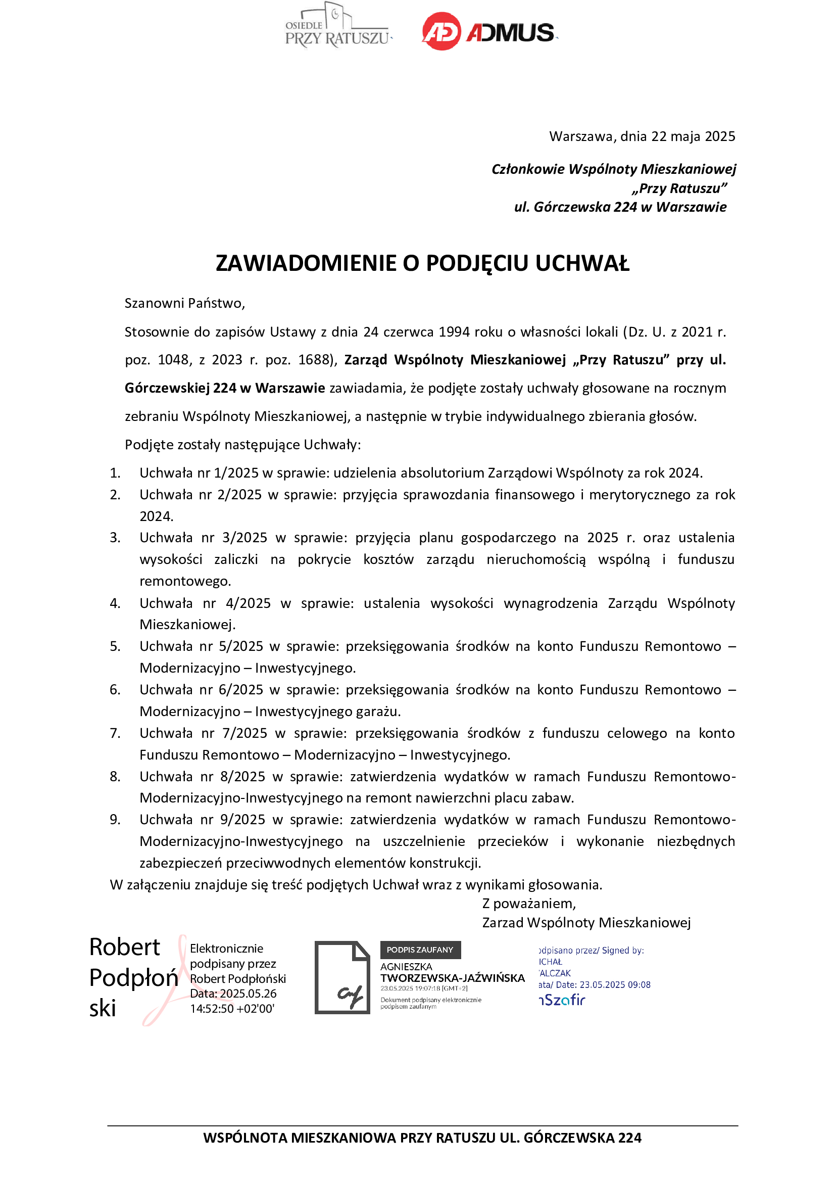 ZAWIADOMIENIE O PODJĘCIU UCHWAŁ