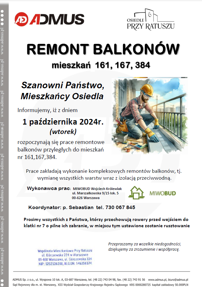 Uprzejmie informujemy, że w dniach 03-04 lipca 2024 r. (środa, czwartek) w godz. 8:00 – 16:00 w obrębie klatek 1-4 budynku Wspólnoty Mieszkaniowej PRZY RATUSZU przy ul. Górczewskiej 224 w Warszawie odbędą się głośne prace związane ze zmianą wielkości nośnika reklamy na elewacji.