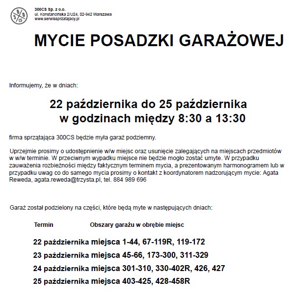 Jeśli będą mieli Państwo ewentualne uwagi, prosimy o zgłaszanie ich na bieżąco do administracji podczas trwania mycia. Po zakończeniu prac nie będziemy mieli możliwości podjęcia działań.