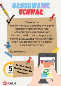 W dniu dzisiejszym pracownicy Admus odwiedzali Państwa w mieszkaniach, z prośbą o wypełnienie karty do głosowania. Część z Państwa była tak miła i wypełniła kartę od razu a część obiecała, że ją wrzuci do skrzynki administracyjnej w klatce 17, bądź wypełni w systemie. Niestety nadal wpłynęło zwrotnie niewiele Państwa głosów na głosowanie nad Uchwałami omawianymi na Zebraniu rocznym Wspólnoty Mieszkaniowej Przy Ratuszu przy ul. Górczewskiej 224 w Warszawie.